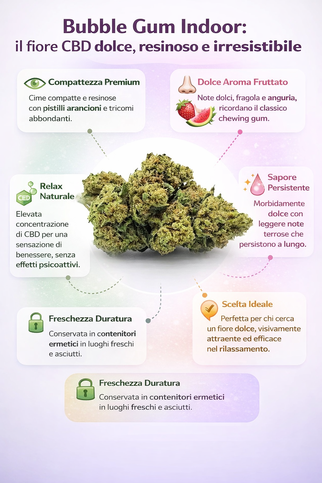 Il Bubblegum è fantastico! Ha un sapore dolce e fruttato che rende ogni tiro un piacere. L’effetto è molto rilassante senza essere troppo intenso, perfetto per una pausa dopo una giornata stressante. Consiglio vivamente a chi cerca un prodotto gustoso e che aiuti a distendersi senza effetti pesanti