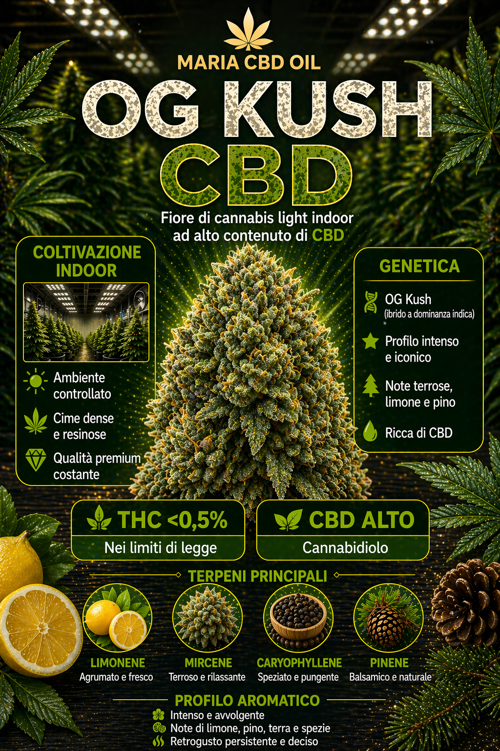 OG Kush buds have a compact and thick structure, covered with numerous trichomes that give it a shiny look. The flowers are dark green with shades ranging from yellow to brown and visible orange pistils. The visual quality of OG Kush is immediately recognisable for its resinous texture and the presence of CBD crystals, a sign of high quality in cultivation. The look is typical of well-groomed and well-grown cannabis, perfect for those looking for a quality strain.