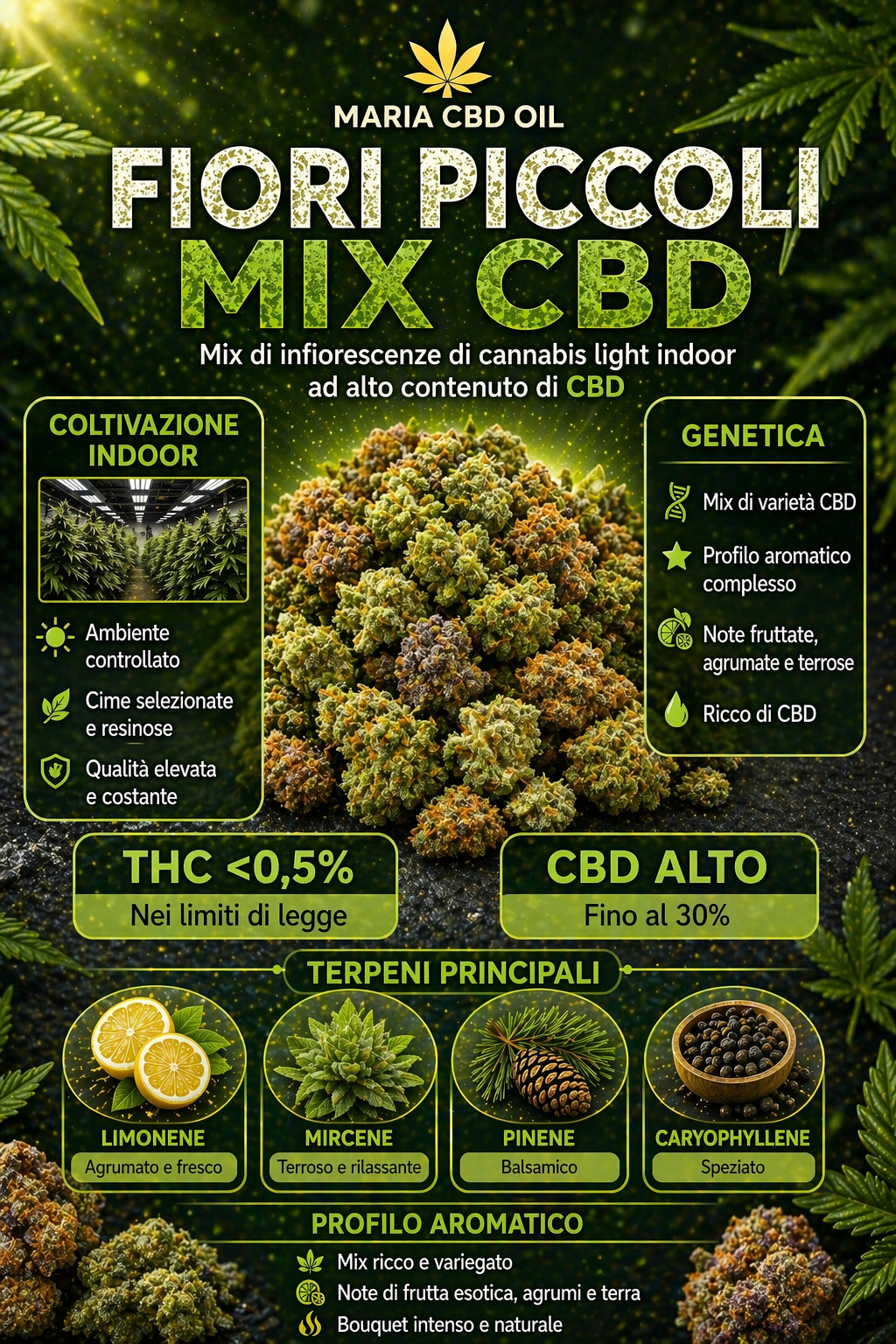 The scent of this mix of legal cannabis is an olfactory symphony that captures the essence of the various strains. Sweet, enveloping notes of exotic fruit blend harmoniously with the acidity of citrus fruits, while herbaceous and earthy nuances evoke the atmosphere of a forest. This combination creates a complex and rich aroma, making the mix unique and a must for cannabis lovers.