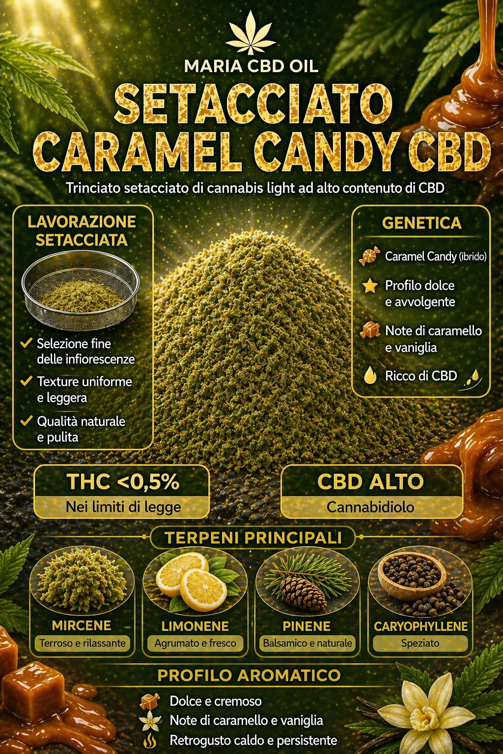 The taste of Caramel Candy CBD Cannabis Trim is true to its aroma, with a burst of sweetness reminiscent of fused caramel, enriched with accents of vanilla and a light toasted aftertaste. The combination of these flavours create a unique and intensely pleasant tasting experience, offering a perfect balance between sweetness and aromatic complexity that satisfies the palate with every taste.