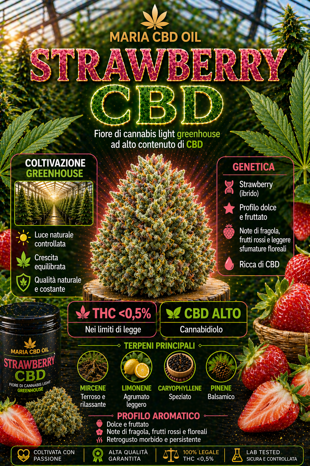Strawberry CBD is particularly appreciated for its beneficial effects on mental and physical health, providing a natural relief from anxiety, pain and contributing to a deep relaxation. Its high CBD content allows one to enjoy all therapeutic advantages of cannabis without psychoactive effects, improving the quality of daily life. This strain supports general well-being and helps maintain an emotional balance and promote restful sleep.