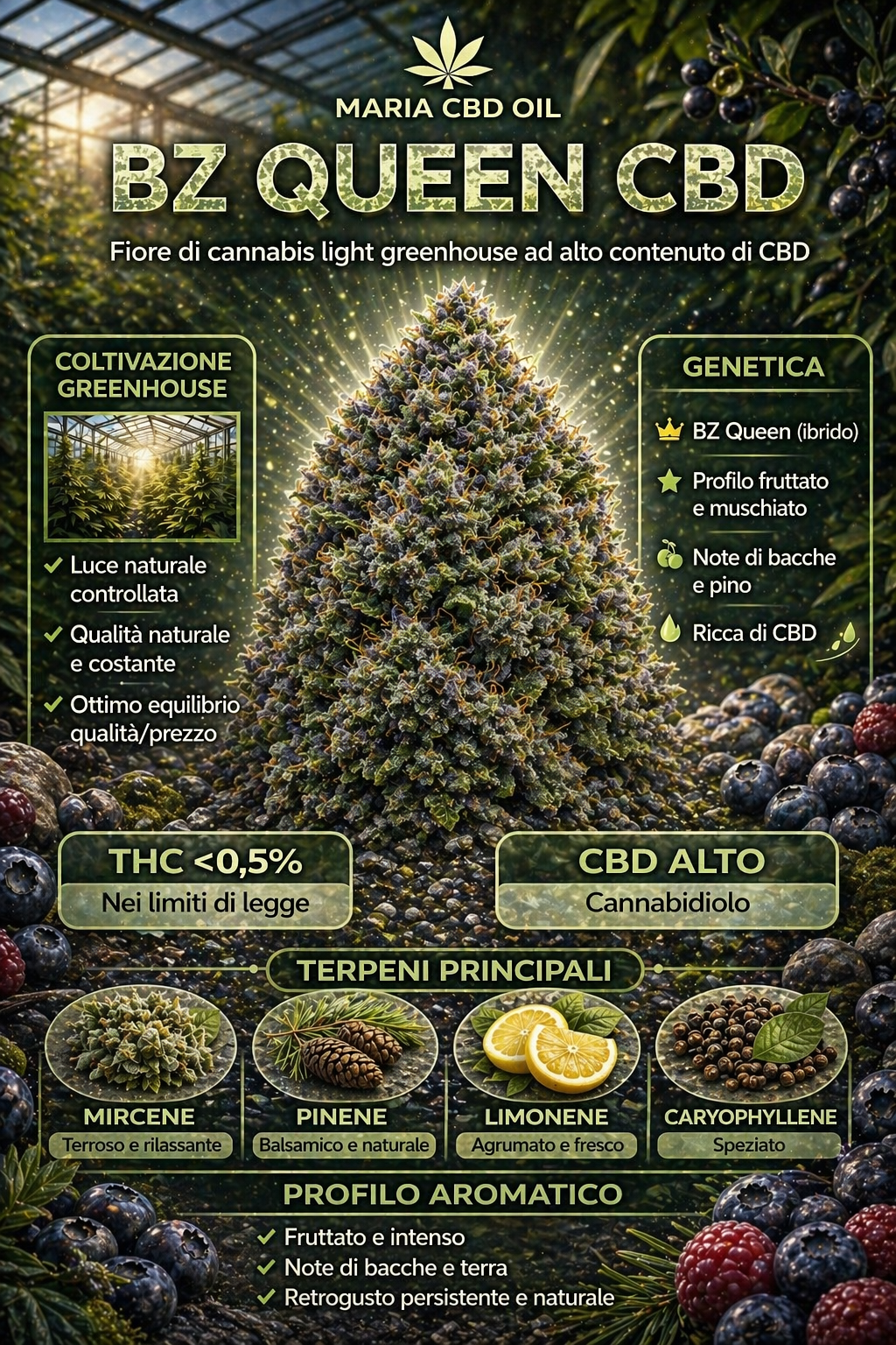 The taste of Bz Queen lives up to its aroma, with a perfect balance between the sweet, fresh notes of berries and more robust, earthy nuances. This mixture of flavours combines harmoniously, offering the palate a rich, satisfying tasting experience. The persistence of the taste, together with its complexity, makes Bz Queen a light cannabis strain that leaves a long-lasting, pleasantly memorable impression.