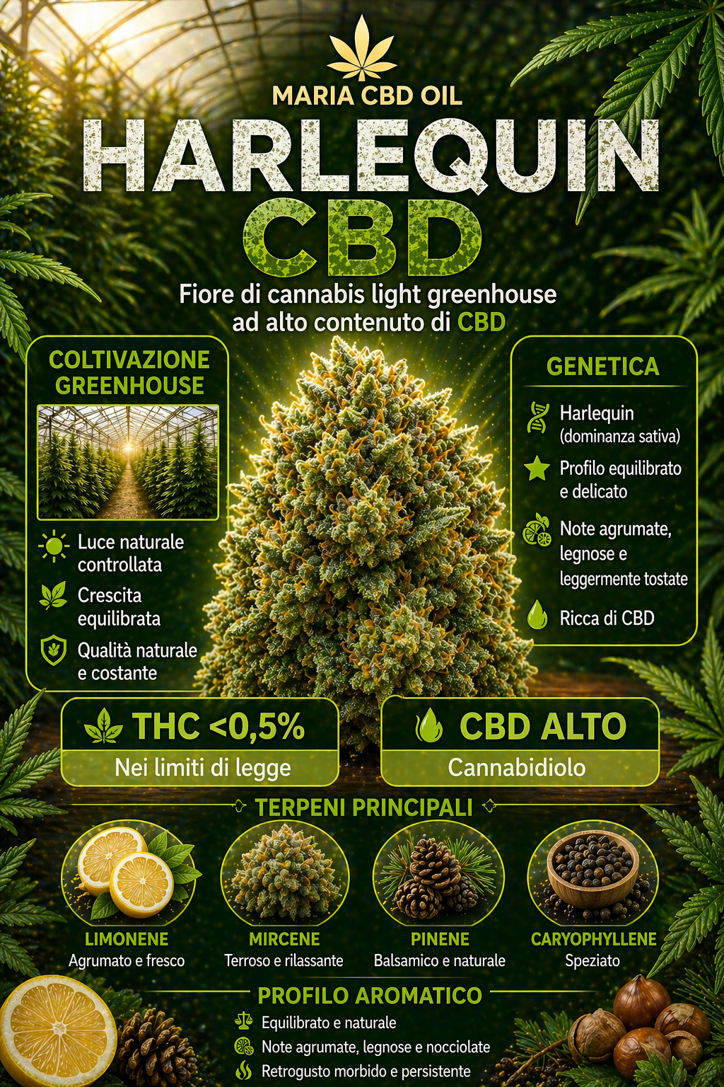 Harlequin’s aroma is complex and layered, with dominant notes of cedar wood and an earthy undertone. These nuances are enriched by accents of ripe fruit and spices, giving the variety a unique and distinctive olfactory profile. The presence of terpenes such as myrcene and limonene adds freshness and liveliness to the aroma, creating an inviting and pleasantly persistent olfactory experience.